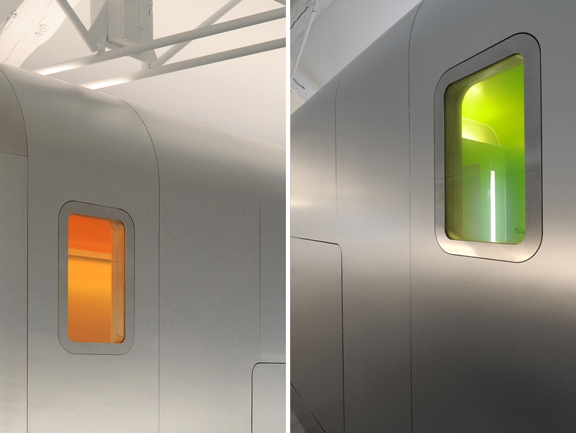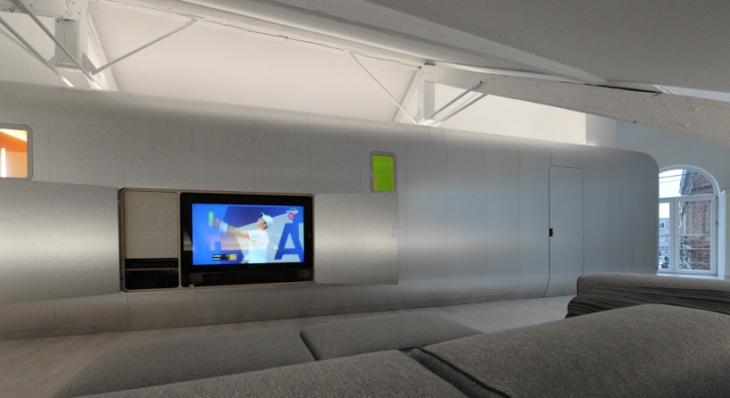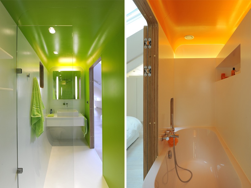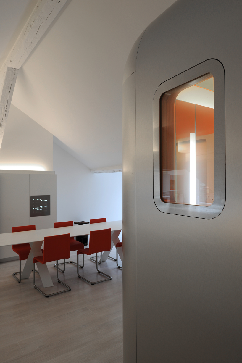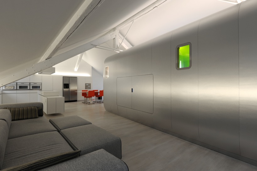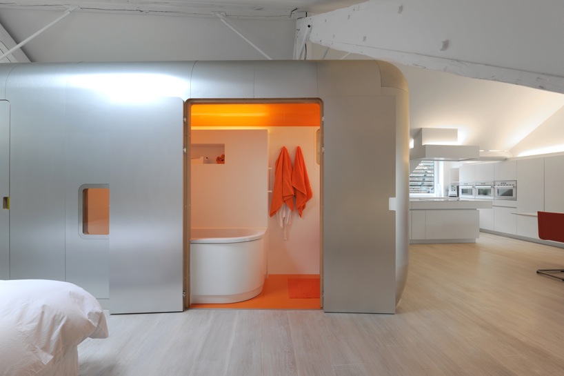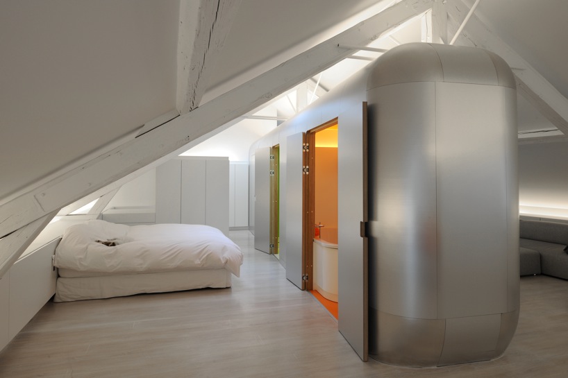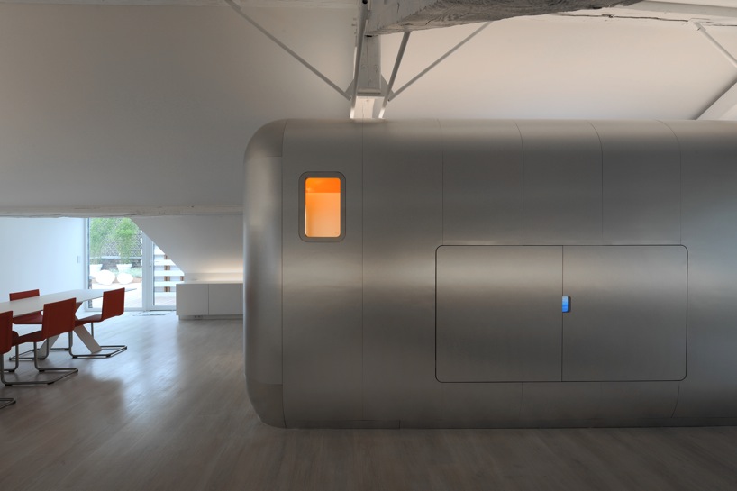 This beautiful loft has found the answer to the question asked by all loft amateurs and their architects : how can we hide the intimate spaces in a place meant to be as open as possible? Putting them in the middle, obvious and visible is a rare option, quite daring but very well invented here. With the creation of a capsule form space, set in the middle of the large room, including the bathroom and toilet, the architect has found a solution and structured the loft in the samen time. Well done.