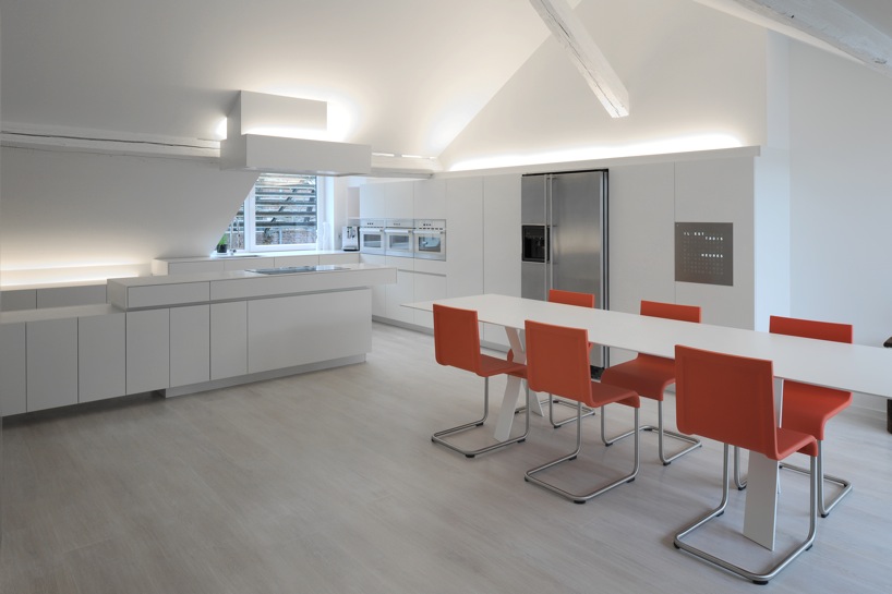 Ce superbe loft a trouvé la réponse à la question que se posent tous les amateurs de loft et leurs architectes: comment cacher les espaces intimes dans un lieu aussi ouvert que possible ? Les mettre en plein milieu, bien visibles est une option rare, osée et ici très bien interprétée en donnant à la salle de bains et aux toilettes une forme de capsule spatiale qui habille et structure l’ensemble de l’espace du loft.